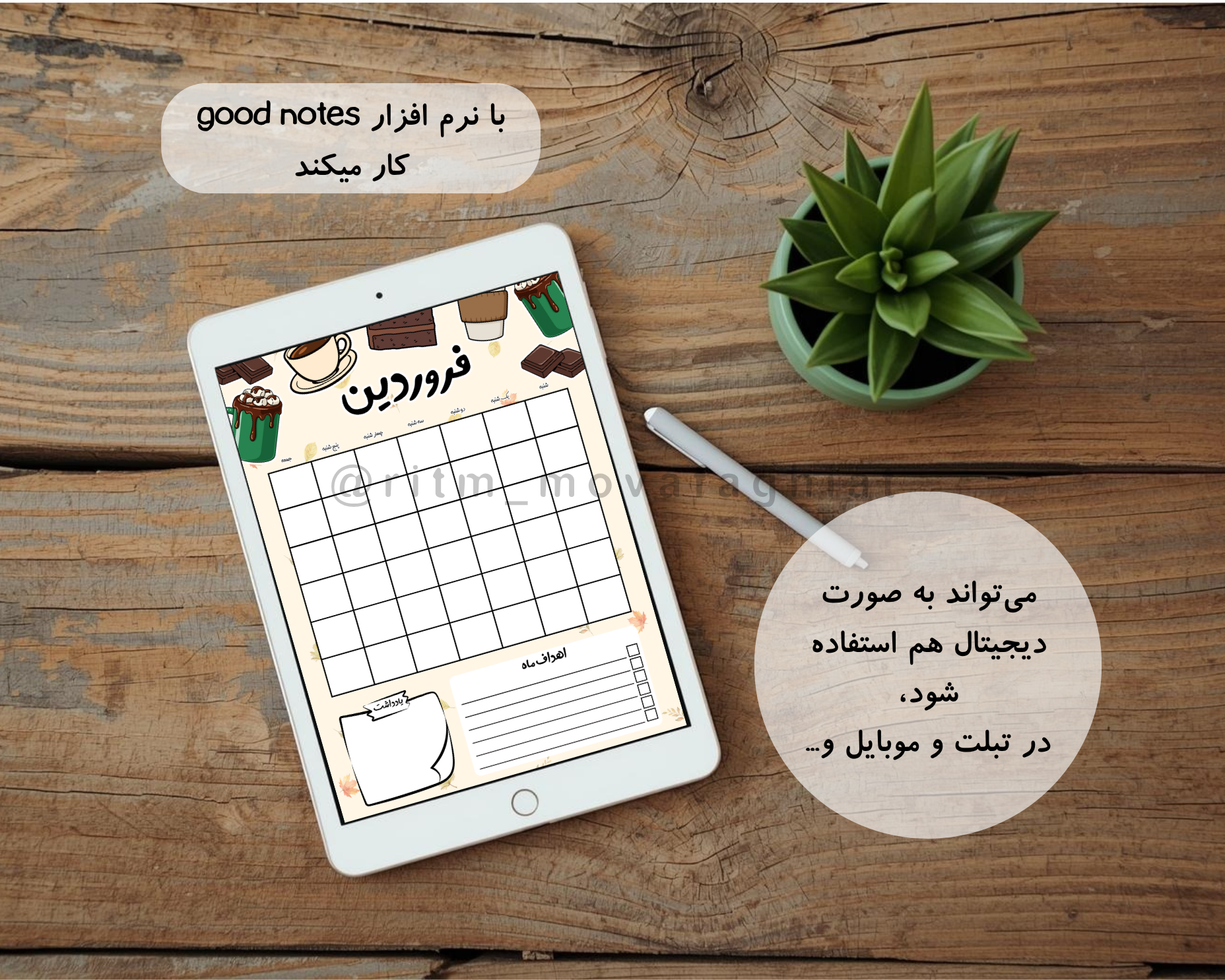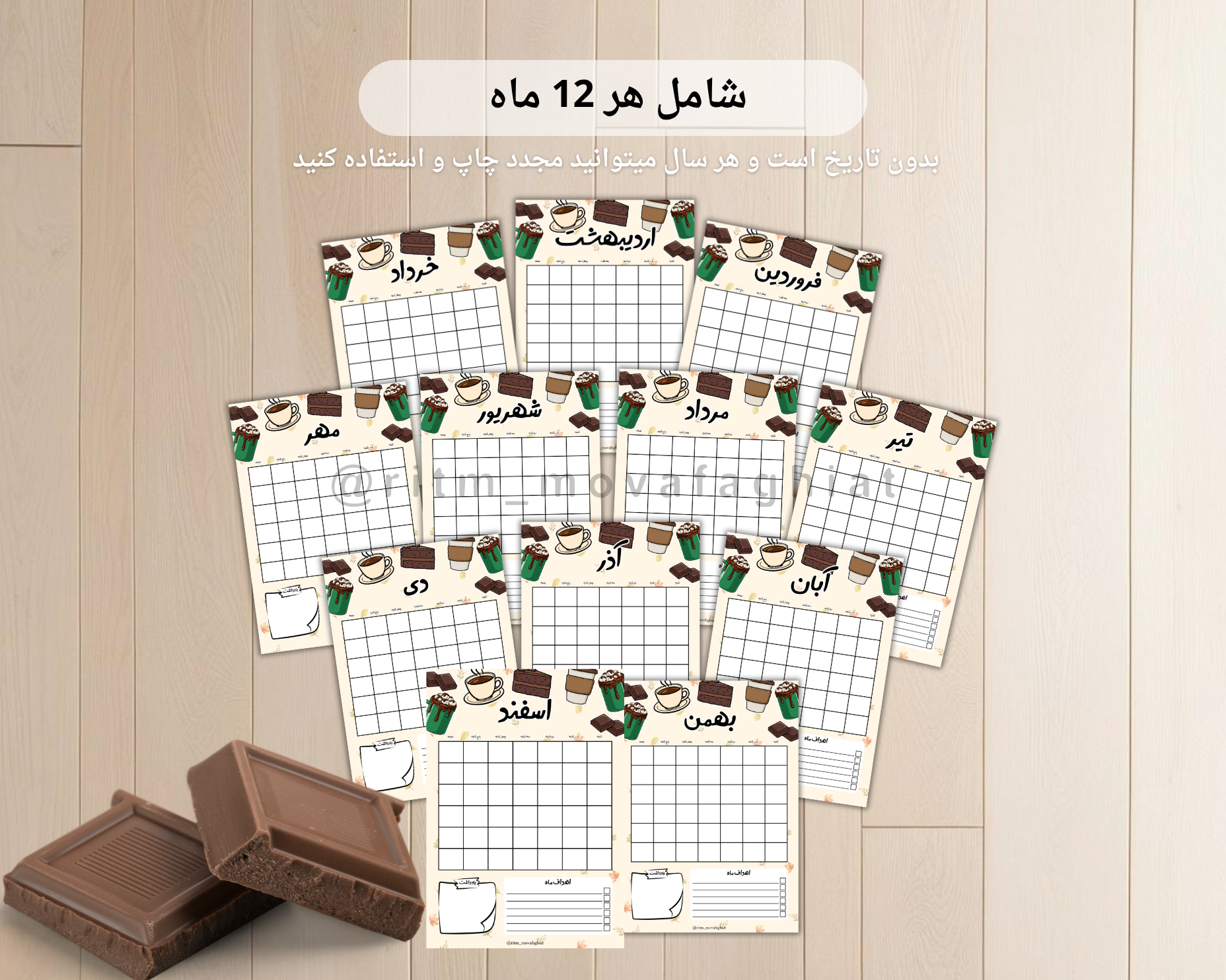 شامل همه ماه ها، تقویم قابل چاپ ، برای برنامه ریزی و هدف گذاری ماهانه،صفحات وظایف ماهانه