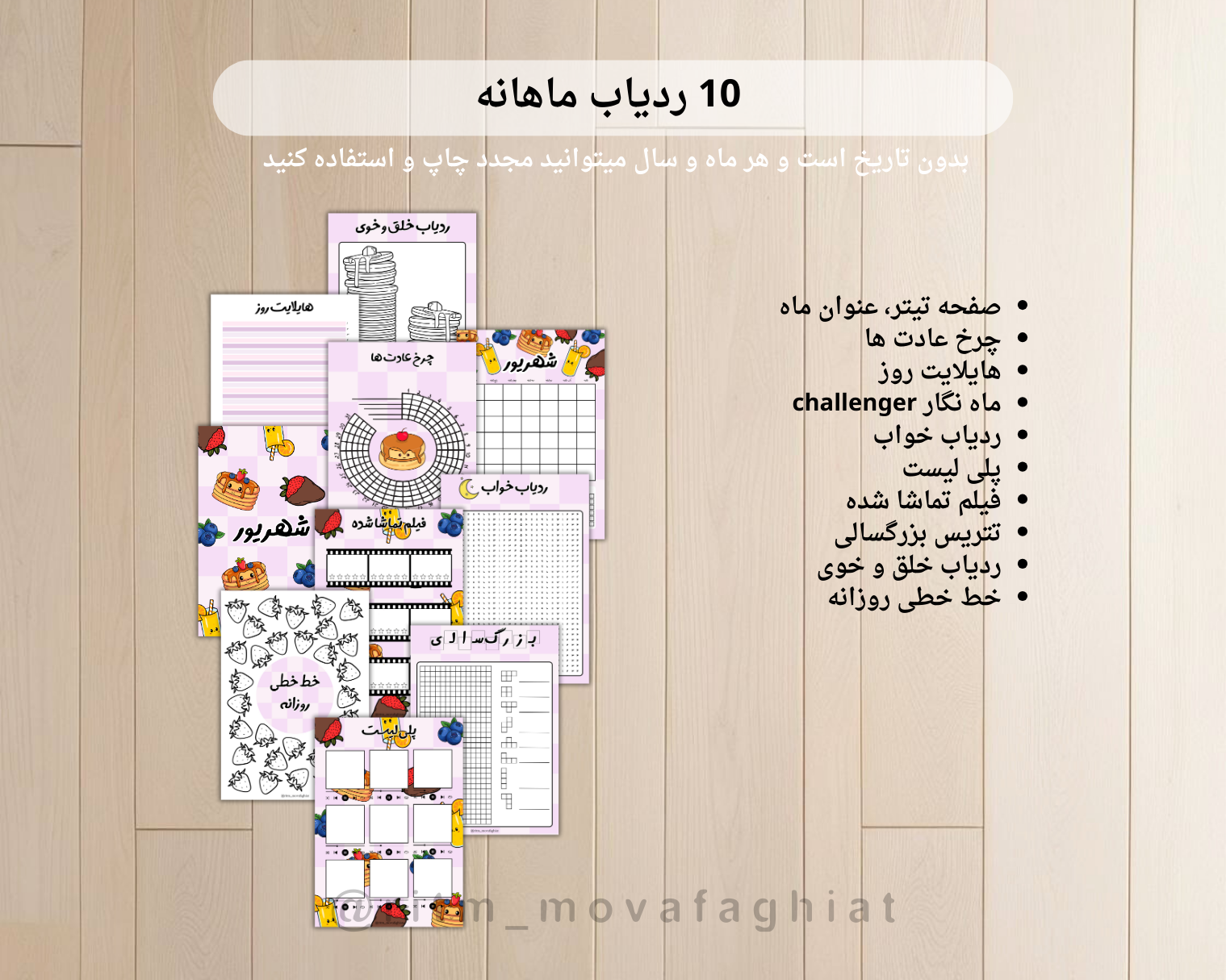 پک ژورنال شهریور ماه ، شامل ۱۰ صفحه از قبل رنگی شده با طرح پنکیک می باشد. با تهیه ی {صفحات عنوان ماهِ} و {صفحات ماه نگار} همین طرح ، می توانید آن را تا پایان سال ،هر ماه مجدد چاپ کنید ، 📑 دقت بفرمائید این محصول فایل دانلودی ژورنال می باشد و قابل چاپ است ، محصول فیزیکی نیست. اطلاعات بیشتر راجع به ژورنال⬇️