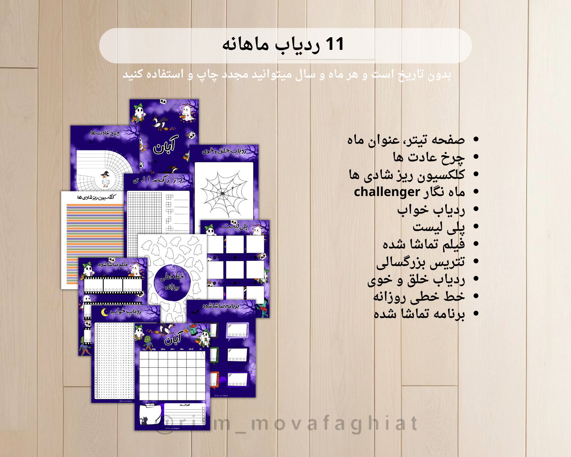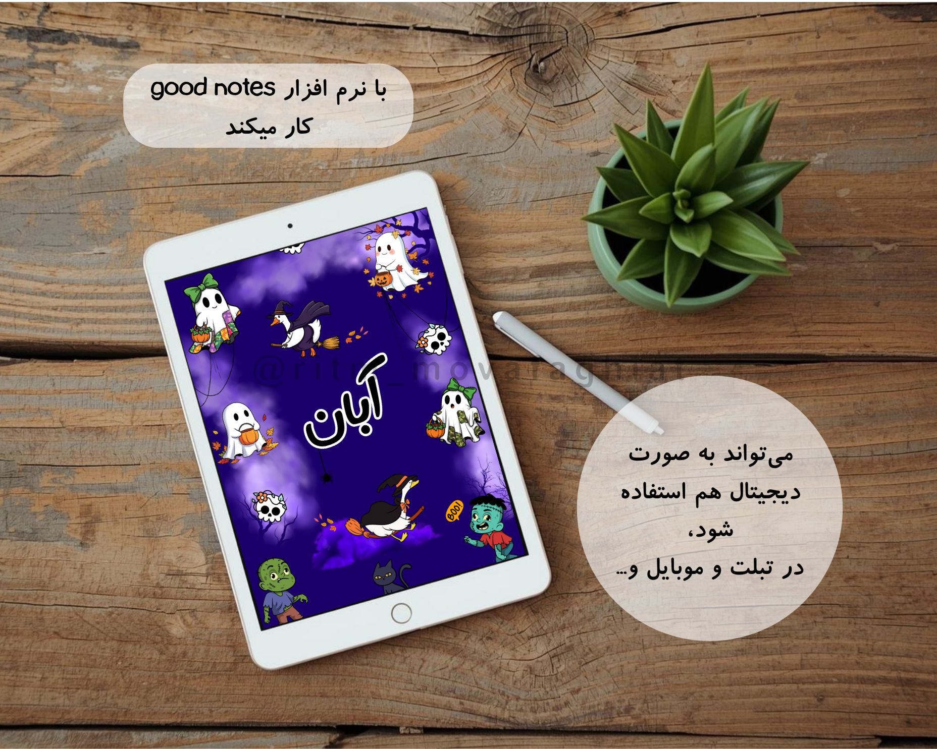 «Boo!» صدای روحهاست وقتی میخوان کسی رو بترسونن! ~ پک ژورنال مناسب آبان ماه ، شامل 11 صفحه از قبل رنگی شده با طرح ارواح و اردک های جادوگر! با تهیه ی بسته {تقویم و عنوان ماه ها} همین طرح ، می توانید آن را تا پایان سال ،هر ماه مجدد چاپ کنید ، 📑