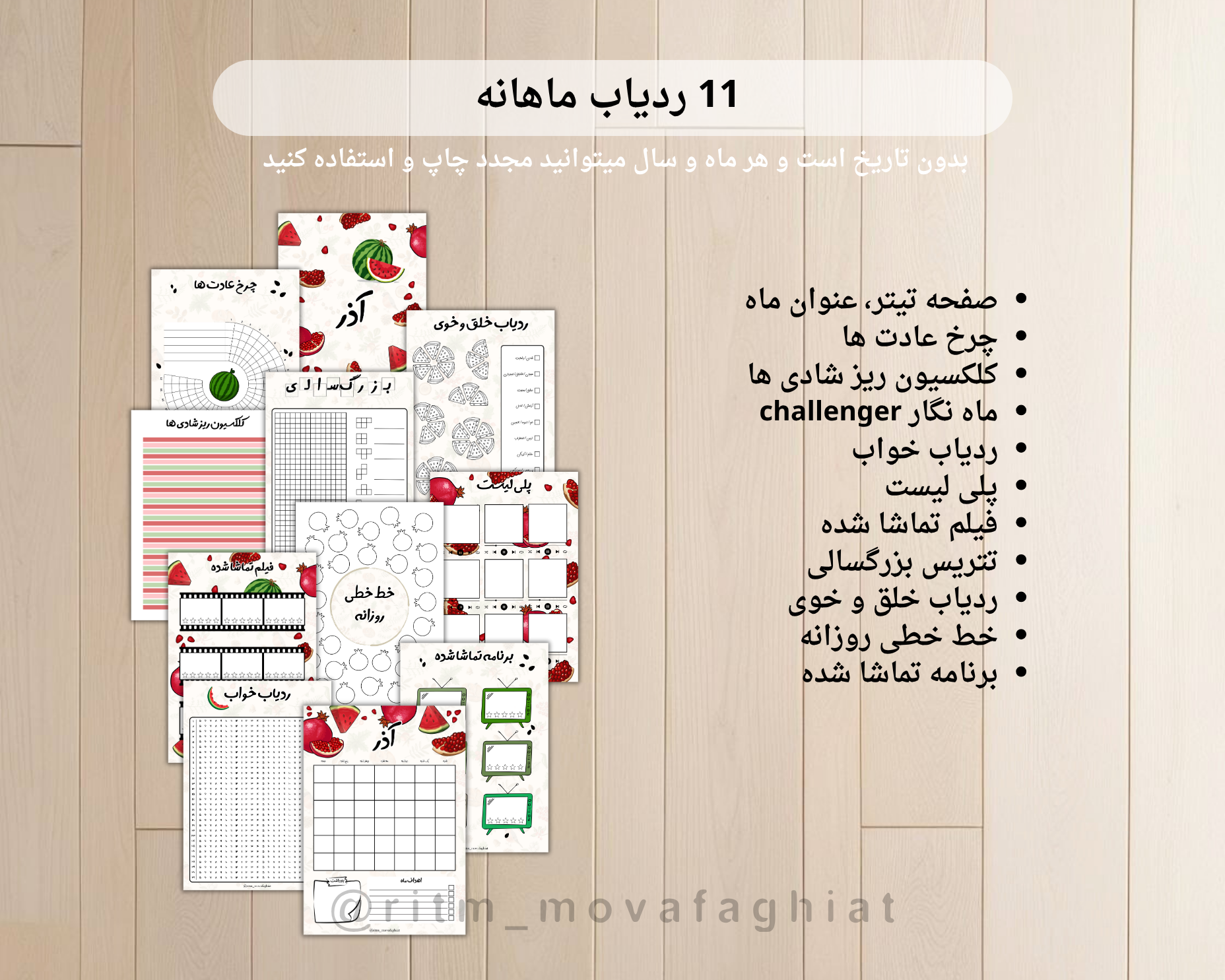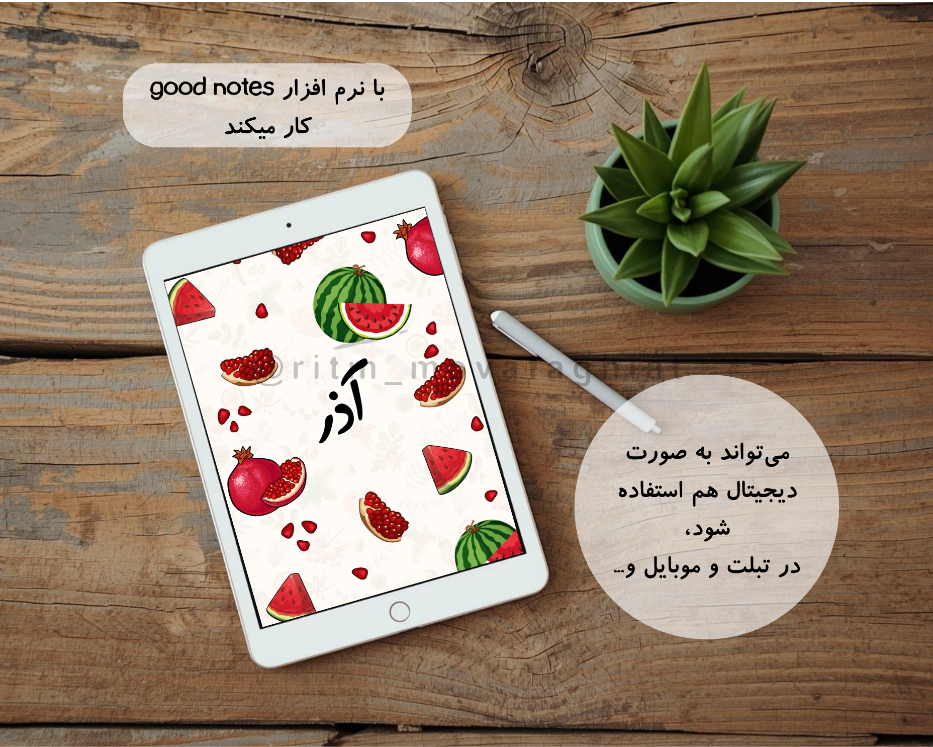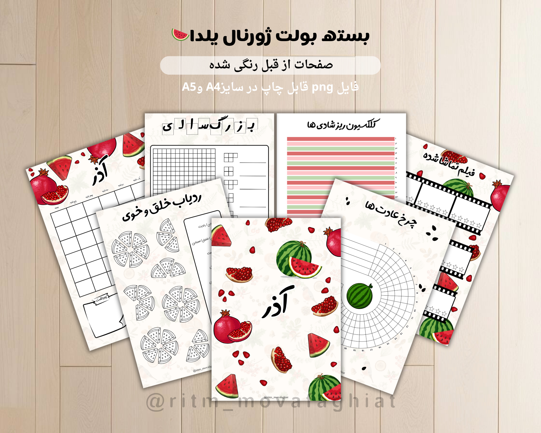 پک ژورنال مناسب آذر ماه ، شامل 11 صفحه از قبل رنگی شده با طرح انار و هندوانه. با تهیه ی بسته {تقویم و عنوان ماه ها} همین طرح ، می توانید آن را تا پایان سال ،هر ماه مجدد چاپ و استفاده کنید. 📑